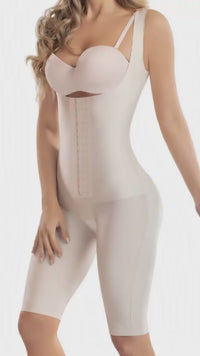 Faja a la rodilla con espalda alta y 3 líneas de broches frontales. Elaborado en microfibra de tacto frío. Control en cintura, abdomen. Tira ancha y gafetes en hombros, tapas perineales y pompas en forma de corazón.
