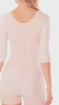 Short postquirúrgico senos libres con mangas elaborado en powernet. Su encaje siliconado en piernas evita que la prenda se enrolle. Broches de 3 líneas frontales y cuenta con una tira sobre el busto para obtener mejor ajuste. Glúteos en forma de corazón.