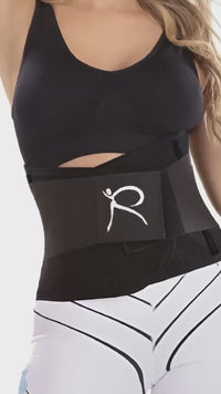 Cinturilla de látex natural. Se cierra con un velcro grueso y para complementar la compresión, con dos elásticos anchos que te permiten graduarla. Al usarla acelera la sudoración ayudando a quemar grasa.